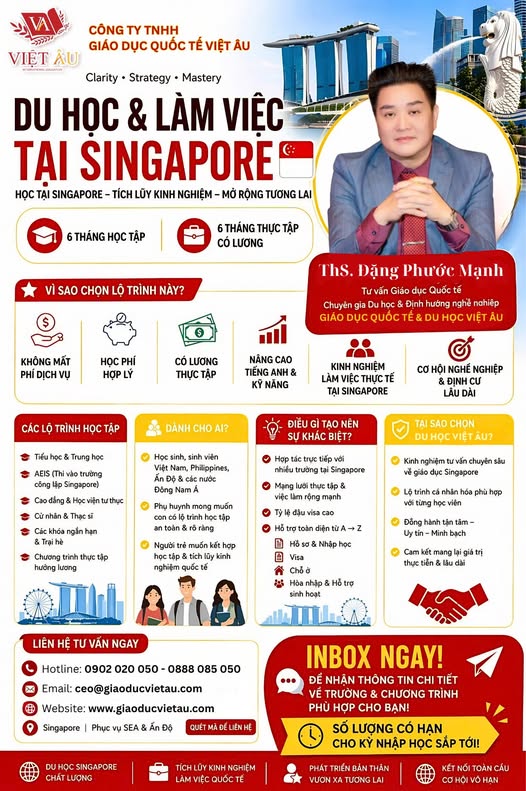 Lộ trình du học và làm việc tại Singapore theo mô hình 6+6 là giải pháp tối ưu cho những ai mong muốn thành công nhanh chóng và bền vững. Với sự đồng hành của Giáo Dục Quốc Tế Việt Âu, hành trình vươn ra biển lớn của bạn sẽ trở nên rõ ràng và tự tin hơn bao giờ hết.